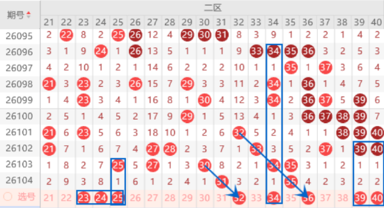 该区间的23 24号数字我们注意一下出一个号码的情况,其中的23号数字可以重点关注一下出号情况。本期的25 27号数字我们也是要在注意落下一个号码的情况,其中的25号数字可以重点关注一下出号情况。本期的32号数字是属于三斜连号码,出号机会是有的,我们可以关注一下出号情况。本期的36号数字是属于斜五连号码,出号机会是有的,我们可以关注一下出号情况。本期的37 38 39 40号数字是属于回补号码,本期是有机会出号的,我们重点关注一下39 40号数字出一个号码的情况就行了。