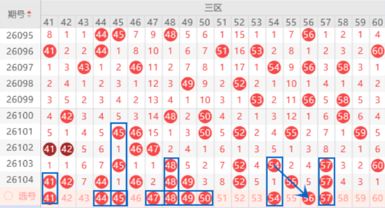 该区间上期开出了41 42 44 46 48 49号数字,本期我们注意一下出重号的情况,其中的41 44 48号数字可以重点关注一下出号情况,本期的夹号43 45 47号数字我们也是要注意出号情况,其中的45 47号数字可以重点关注一下出号情况。本期的50号数字出号机会也是有的,可以防守一下48 50号数字同出的情况。本期的54号数字出号机会也是有的,我们可以防守一下54 57号数字同出的情况,本期的56号数字是属于三斜连号码,本期出号机会也是有的,本期可以防守一下47 56号数字同出的情况。