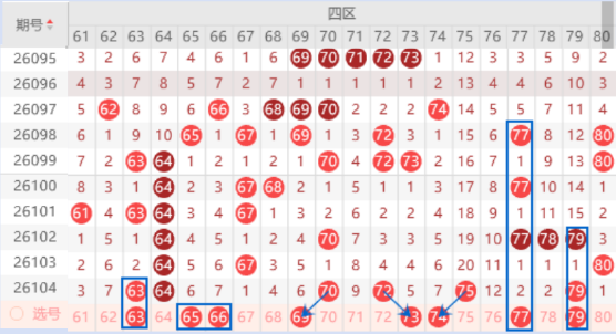 该区间的63号数字我们注意一下出重号的情况,本期的防守一下63 66 69号数字同出的情况。本期的65 66号数字都是属于对称号码,出一个号码的机会是有的,可以重点关注一下,也可以防守一下同出的情况。本期的73 74号数字我们注意一下出一个号码的情况,其中的73号数字可以重点关注一下出号情况。本期的77 78号数字我们注意一下落下一个号码的情况,其中的77号数字可以重点关注一下,本期可以防守一下77 79号数字同出的情况。