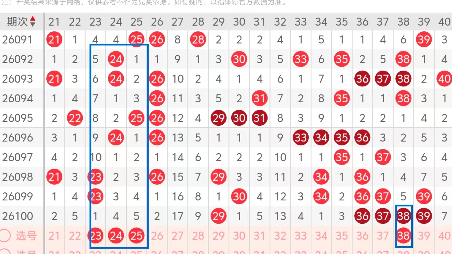 第二区间的走势分析:第二区间上期开出了五个号码球,主要的落号点位在二区间的后半区,走出了三奇两偶的形态走势,上期二区间的前半区落下了一个号码球,后半区落下了四个号码球,整个二区间处于走热的趋势,根据二区间的走势规律,今天的二区间我们主看前半区23 24 25这三个号码球的落位,可以重点关注,注意23 24的组合以及24 25的组合,再看38的重码,走出了对称的走势形态,这四个号球建议大家打个四胆拖,或者打个四码复三比较稳妥,参考为主!