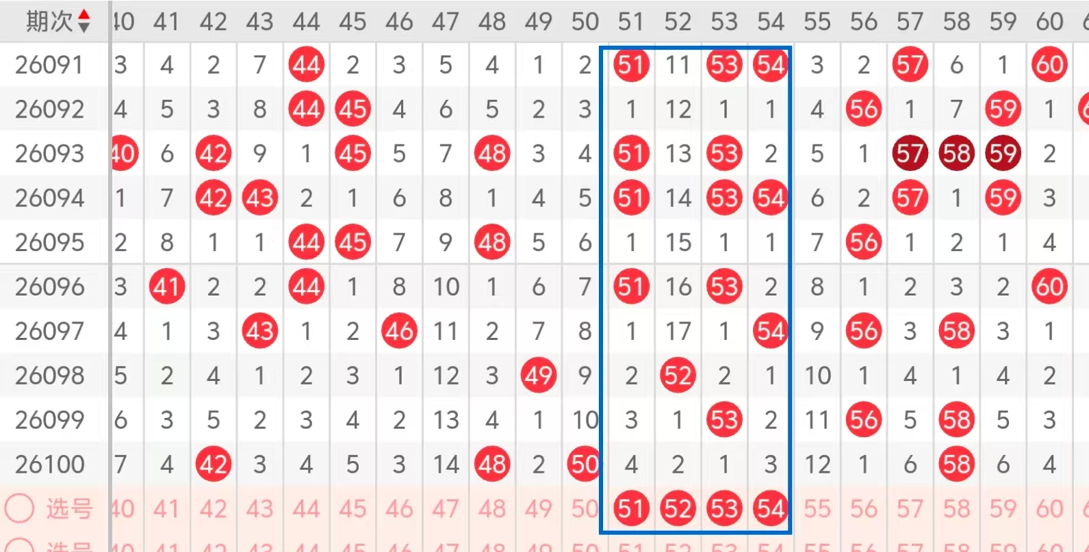 第三区间的走势分析:第三区间上期开出了四个号码球,主要的落号点位在三区间的前后半区,走出了四偶的形态走势,上期三区间的前半区落下了两个号码球,后半区落下了两个号码球,整个三区间处于走冷的趋势,根据三区间的走势规律,今天的三区间我们主看51 52 53 54这几个号码球的落位,冷热码的组合,今天落下的机会很大,特别是51 53 54的组合,51 52 53的组合,52 54的组合,这四个号球建议大家打个四胆拖,或者打个四码复三比较稳妥,参考为主!