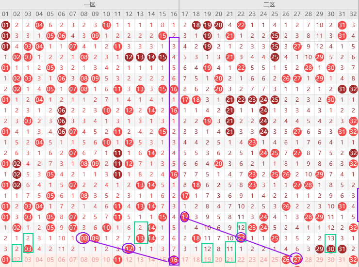 边号2 4 11 13出一码,重号防3 12,形态上11 16是斜连号,上图已勾画,遗漏值隔2期号出2期,本期只有2 7 5三出一 ,上期一区只出2码,本期应该是回补,有概率出4-5码,16到短期最大遗漏值,11是非常看好的斜连号,防11不出出1,关注五码1 4 5 13 16防11,一胆4 双胆4 16