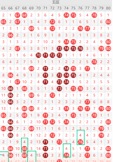 边号65 67 69 70 72 73 75 76 78 79出1-2码,重号66 88 71 74 80出1-2码,上期重号都出五区了,本期五区应该有三直落优先68,昨天形态73是正点位没出,本期73直接用,重号74优先,73 74极大概率同出,遗漏值隔4期号出3期,本期隔4期号65 69二出一,6尾最热66 76选一码,关注五码65 68 69 73 74 双胆69 73