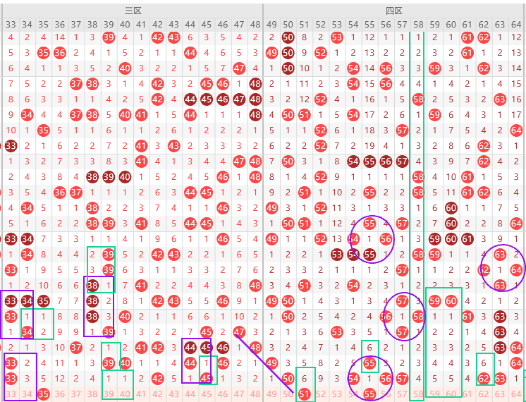 上期四区走热,正常热区还可以再跟一期,边号51 49 53 55 58 61 64出1-3码,重号50 54 56 57 62 63出一码,形态上51是斜连号,遗漏值隔6期号出2期,本期只有51符合,上图已勾画,遗漏值58到短期最大遗漏,55是梅花形态,59 60防二出一,关注五码49 55 58 60 61 防52,双胆49 58