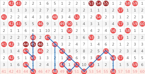 这个区间上期开出了(44.49.51.53.59)5个号码球,上期三区间开出热态5码落位,区间前端给出44.49孤码球开出,那么通过对三区间整体的趋势来看我认为接下来三区间号码在区间走出震荡号,我们要调整区间号码的温态落号,那么通过分析来看三区间在近期会继续走出温态的可能性最大,所以我们考虑控一回补的号码更为为妥,个人更看好52的冷号回调,本期间预测出号在3-5码