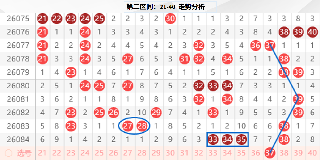 二区分析:【21-40】(走势图标注号码非小黄车大底,请谨慎参考,具体思路将在直播间分享讨论)