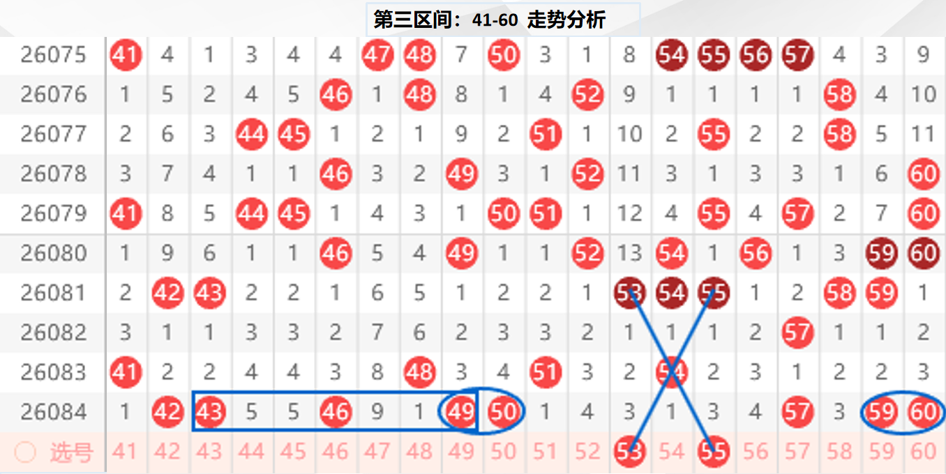 三区分析:【41-60】(走势图标注号码非小黄车大底,请谨慎参考,具体思路将在直播间分享讨论)