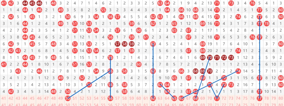 【第二区间41-80】:上期开出8个号码。本期推荐:50-56-62-65-66-68-71-77八个号码。50同路号码,同时看重;56着重从等距号码考虑,50-56为常见组合;62-65-66-68-71之所以推荐,主要考虑周期同路号码在号段回补,62为遗漏等距号码,65斜连,66偶数斜连五期号码,68斜连的同时,延续上期8尾出号;71作为段尾首先回补考虑;77上下对称看好重号开出。区间推荐重点号码:三小区间50-56,四小区间62-65-66-68。
