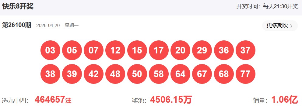快乐8第2026100期开奖号: