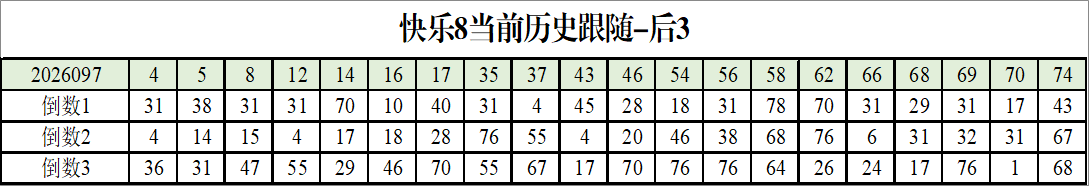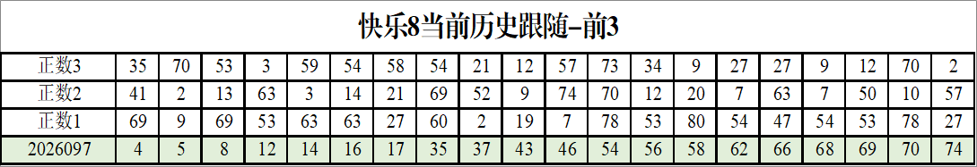 我感觉选热的同时,还要注意防冷条件开出,可以直接选取每个号码跟随出次前三的号码,也可以考虑把出次最后的三个数字加进去,不过这样可能号码太多,可以尝试。图上也能看出单独号码跟随的情况,我就不一一统计每个号码的出次了,我这里考虑提高概率,取每个号码历史跟随的前三号码和后三号码,根据2026097期的号码,我关注正数3和倒数3的号码号码为: