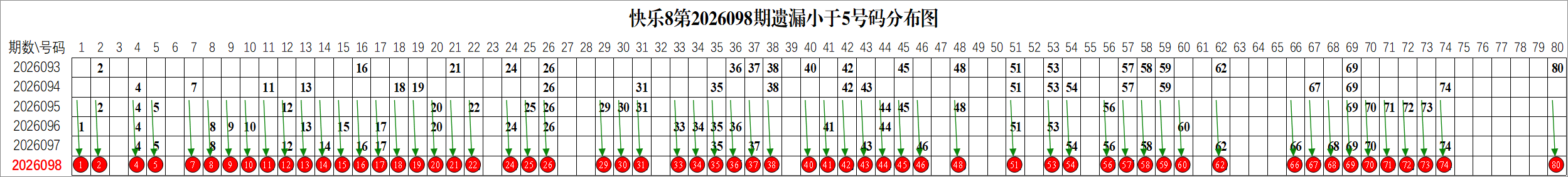 所以这个条件值得关注,从号码分布图上我们可以分析出,遗漏小于5期的号码有: