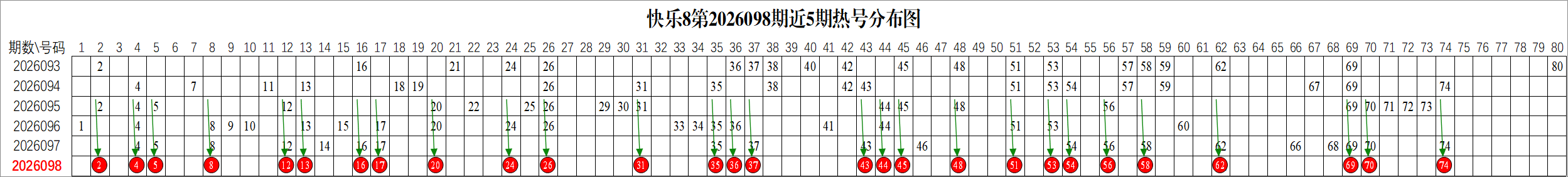 快乐8第2026098期多条件统计分析组号(上期对1组选7中5)