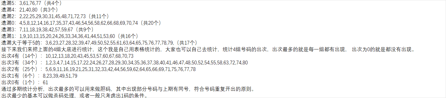 我的基本思路是通过号码尾数情况,取出6尾相关的号码作为第一组大底,然后统计号码跟随的情况分析出第二组大底,通过短期遗漏分析形成第三组大底,再按照对数补数分析统计出第四组大底(根据情况可能实时增加其他大底 ),最后把这些大底进行统计,重点关注出次最多的号码,搭配出次少的号码,灵活组号,形成本期精选胆码。