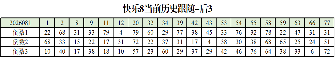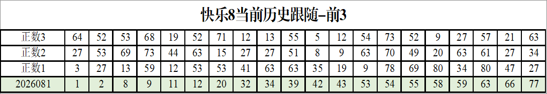 我感觉选热的同时,还要注意防冷条件开出,可以直接选取每个号码跟随出次前三的号码,也可以考虑把出次最后的三个数字加进去,不过这样可能号码太多,可以尝试。图上也能看出单独号码跟随的情况,我就不一一统计每个号码的出次了,我这里考虑提高概率,取每个号码历史跟随的前三号码和后三号码,根据2026081期的号码,我关注正数3和倒数3的号码号码为: