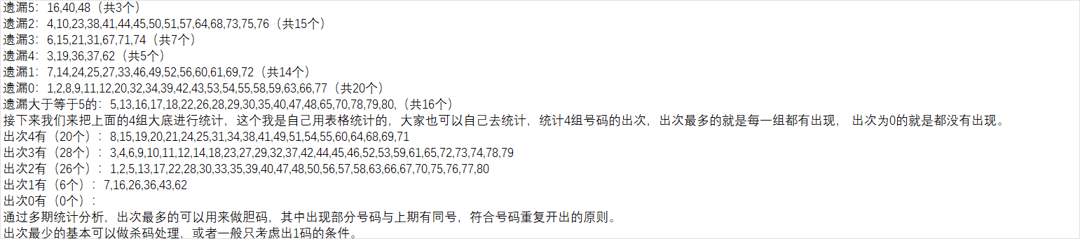 如果把对数和补数合起来有40个号码,中间可能还会产生一下重复数,通过近几期的统计分析,以上期数据进行补数对数计算推算下一期的概率不高。为提高概率,我主要是用前两期的数据来进行对数补数推算,然后再组成一个集合,作为我的第四组大底号码。