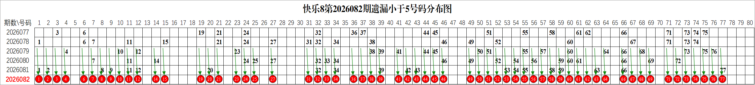 所以这个条件值得关注,从号码分布图上我们可以分析出,遗漏小于5期的号码有: