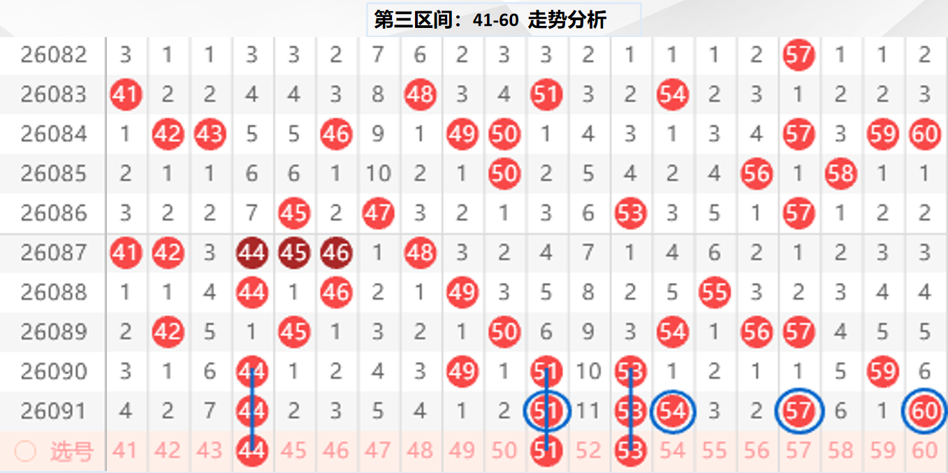 三区分析:【41-60】(走势图标注号码非小黄车大底,请谨慎参考,具体思路将在直播间分享讨论)