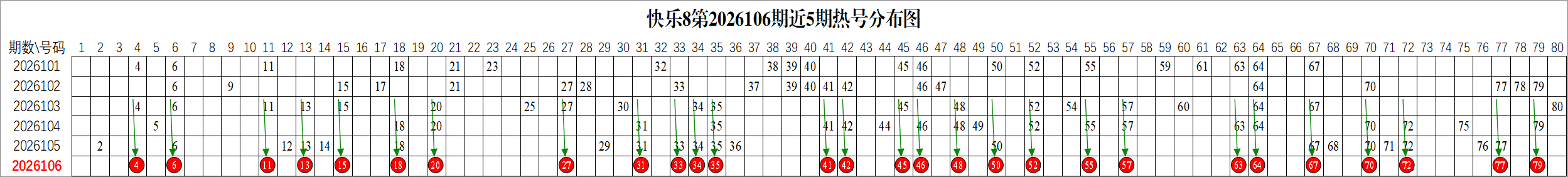 尾数分析其实是简化号码的做法,把80个号码用10个尾数来分析,通过多期来看,尾数变化灵活多样,我的思路是把上期尾数出次进行统计,分析出次多少情况,一般情况下,最热的尾数,下一期基本不会持续热下去,上期最冷的尾数,下一期也不会持续冷下去,所以我选取上期尾数排序中间的6个尾数作为本期看好的尾数,那么6个尾数包含了60个号码,相比较也是大概率开出号码的条件。