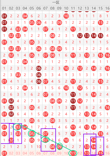 边号7 10 12 15出1-2码,重号8 9 13 14出一码,一区走冷趋势,本期应该在4码左右,重号不断,本期重号优先13,形态上11是斜连号,上图已勾画,短期规律看上图勾画重号出边号,凤尾一直在出边号,上期14是重号,边号只有13 15二出一,有机会同出,上期1-7区间没出号,本期要回1-2码,1 2应该有一码,16到短期最大遗漏值,关注五码1 2 4 13 15防12,一胆15双胆1 15