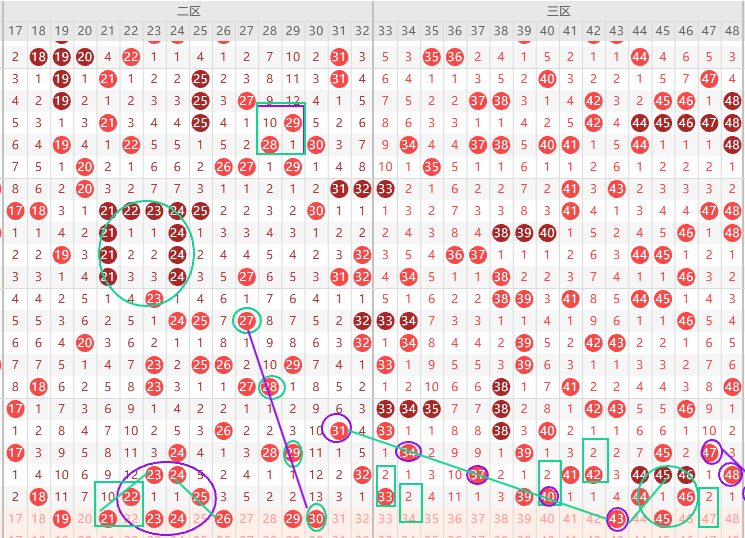 三区是走冷趋势,本期建议选4码内,边号34 38 41 42 43 45 47出2码,重号33 39 40 44 46出一码,缩小范围遗漏值隔2期号出多期本期只有34 47二出一,形态上43是斜连号,上图已勾画,45是梅花形态,4开头看好出2-3码,3开头2码,昨天冷号36没出,48没重,本期比较看好杀回马枪出号,关注五码36 38 43 45 47防48,一胆36双胆36 48