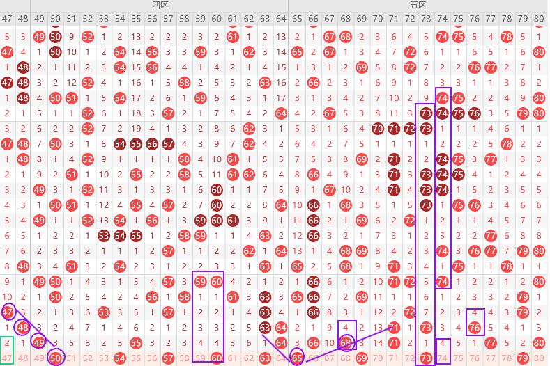 边号50 54 56 63出1-2码,重号49 55 64出一码,重号先看64,短期规律连号四期内会回补一码,本期59 60二出一,形态上50是斜连号,上图有勾画,防52,这个区比较冷建议别多选,关注五码50 54 57 59 60防64