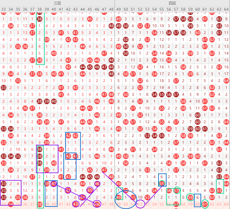四区是走冷趋势,边号50 52 54 58 60 61 63出1-2码,重号49 59 二出一,形态上50是梅花,52 61是大斜连号号,上图已勾画,遗漏值隔一期号出2期,本期50 56 57 63出1-2码,遗漏值隔6期号出3期,本期只有60,隔5期号出2期,本期只有58,关注五码50 55 57 59 61防63,双胆57 59