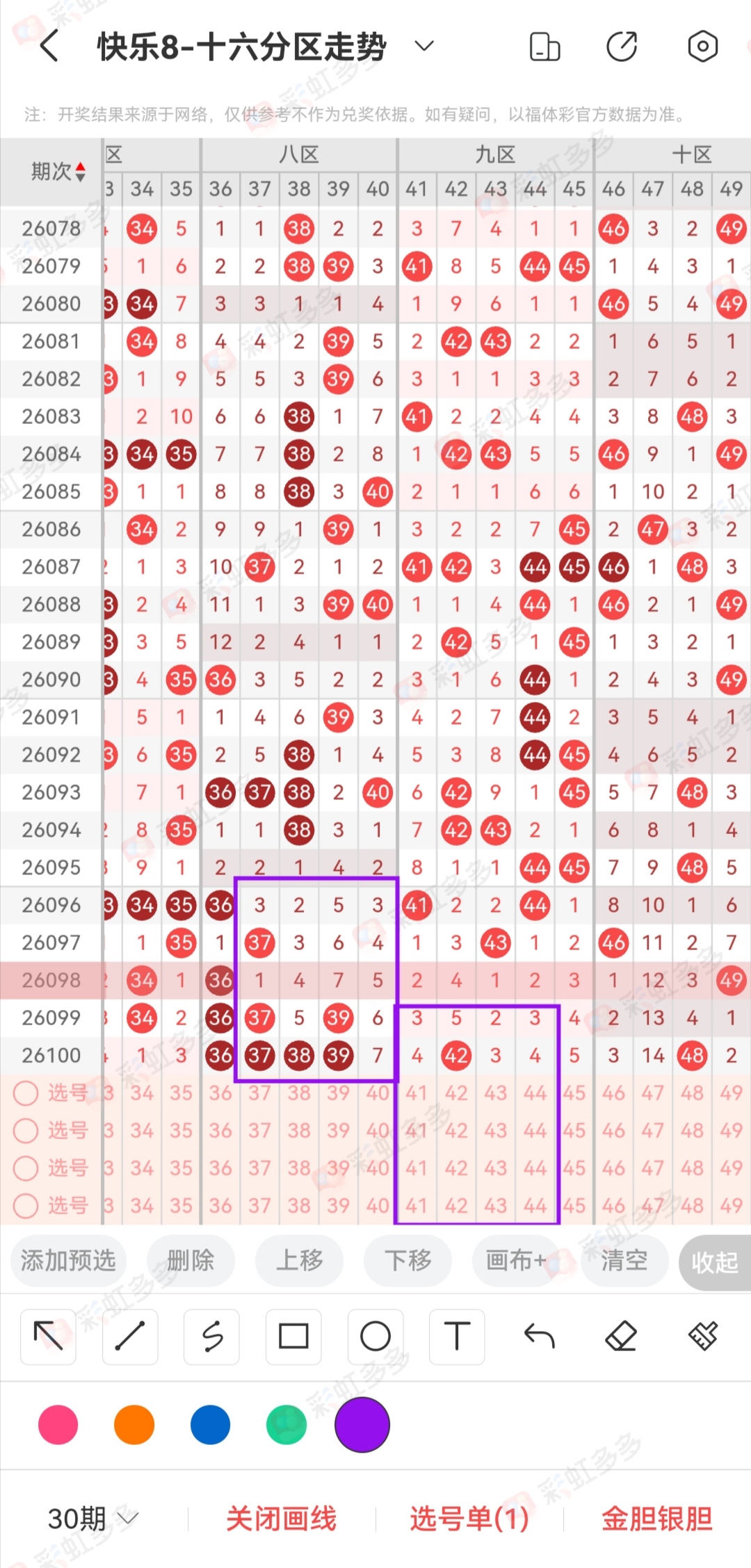 第二个点我们说一下定位区间考虑,这个是不太准的,但是可以给你一个变相的考虑。比方说昨天的2头数据验证,12期遗漏间隔1间隔4间隔1存在空区的逻辑,当然那天的空区并不是这样得出来的。但是我们昨天的考虑就是通过空区延伸得出来的,虽然21-30没有完全空区,或者说昨天的71-80没有完全空区,实际上就来1码等同于空区。那么我们看来一下今天的4头,5235遗漏近期出过一次,当然这里要注意,模仿形态最主要的还是看数量以及和值或者背靠背,相同点不同点,细节很重要。3头37-40出1吗以后第二天空区,那么我们这里能不能也是这样,小范围是自身,比方说37-40,今天的41-44。精确定位这样子错的不会太离谱。不知道学会了没。当然了80个号码你看的时间越长,体会越多,规律都是在指甲缝里得出来的。时间如流水,抓得住抓不住就在一瞬间。所以说机不可失失不再来!祝大家中选十上岸!