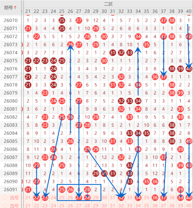 二区间注意打底是22.25.26.28.32.30.34.35.37.39.40中关注参考4-5码开出机会,