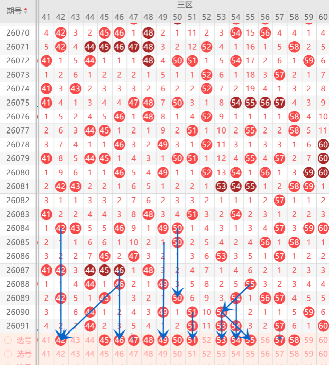 而三区的打底号是42.46.47.49.50.53.54.55.57.59.60中参考3-4码开出机会,