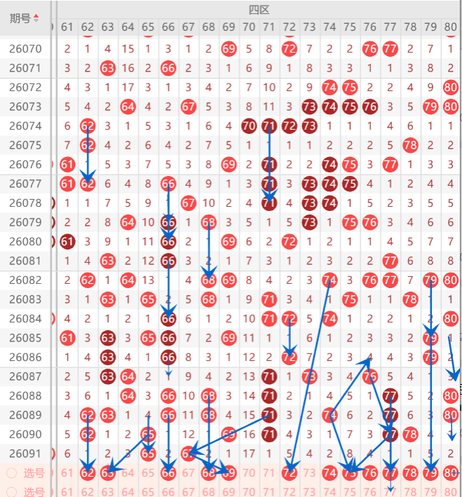 四区间关注的打底号是62.63.66.68.73.75.76.79.80中参考3-4码开出机会