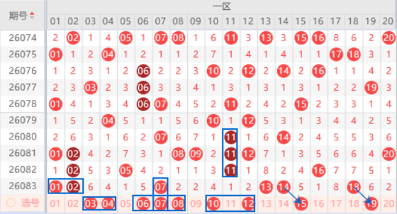 该区间上期开出了01 02号数字,本期我们注意一下03 04号数字同出的情况。上期开出了07号数字,本期我们注意一下走分边的情况,所以本期的06 08号数字我们注意一下出一个号码的情况。本期的10 11 12号数字是属于三重号码11号数字的回补号码,本期我们注意一下出一个号码的情况,其中的10 12号数字可以重点关注一下出号情况。上期开出了18号数字,本期我们注意一下19号数字出号情况,本期可以防守一下16 19号数字同出的情况。