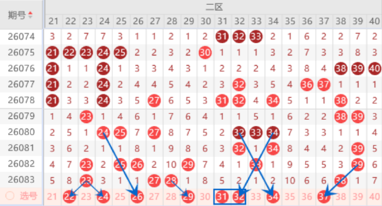 该区间上期开出了23号数字的重号,本期我们注意一下走分边的情况,所以本期的22 24号数字我们注意出一个号码的情况。本期的26 27号数字是属于连号斜连号码,出一个号码的机会是有的,我们可以重点关注一下。本期的27 28号数字我们防守一下出一个重号的情况,其中的28号数字可以重点关注一下。本期的32 34号数字是属于交叉对称号码,本期是有机会出一个号码的,我们可以重点关注一下。本期的37号数字是属于对应斜连号码,出号机会也是有的。