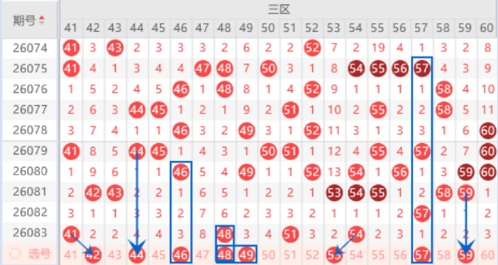 该区间的42 43号数字我们注意落下一个号码的情况,其中的42号数字可以关注一下。本期的44 45号数字我们也是要注意落下一个号码的情况,其中的44号数字可以关注一下出号情况。上期开出了48 51 54号数字,那么本期的中间数49 50 52 53号数字我们要注意出号情况了,其中的49 53号数字可以重点关注一下出号情况。本期的57号数字是属于321走势,本期可以防守一下57 59号数字或者57 60号数字同出的情况。