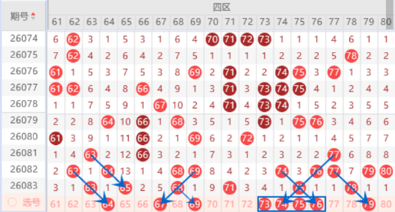 该区间的64号数字是属于对应斜连号码,出号机会是有的,可以重点关注一下出号情况。上期开出了68号数字重号,本期我们注意一下走分边的情况,所以本期的的67 69号数字我们要注意出一个号码的情况。上期开出了75 78号数字,本期我们注意出一个重号的情况期,其中的75号数字可以重点关注一下出号情况。本期的73 74号数字我们也是要注意出一个号码的情况期,其中的74号数字可以重点关注一下出号情况,本期可以重点关注一下34 74号数字同出的情况。