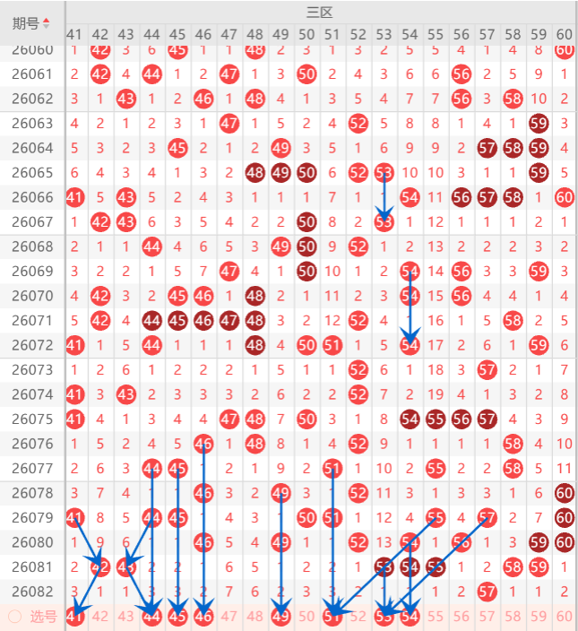 而三区的打底号是41.44.45.46.47.49.51.53.57.60中参考3-4码开出机会,