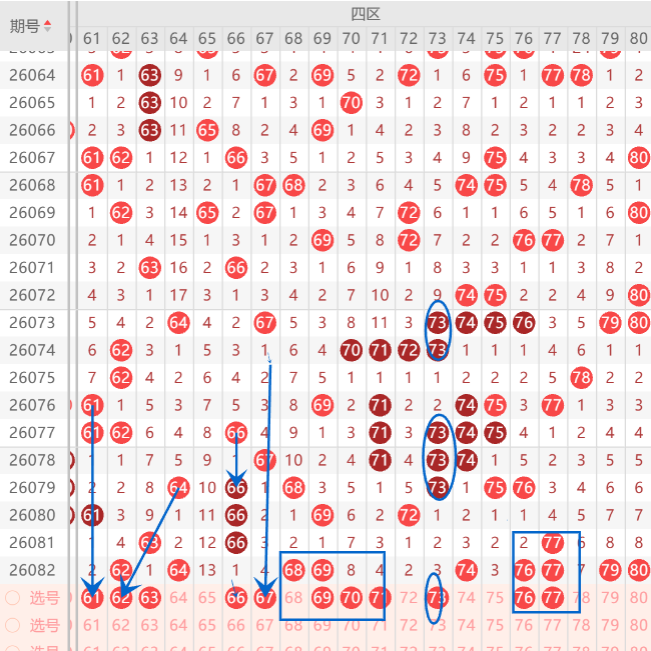 四区在近期的走势上来判断机会的话,整体区间开出走热形态,上期四区间直接爆区开出了9码,而且上期区间开出的形态是孤码分边和重码空位回补走势,上期小妹在文章中布局到了6码开出,那么本期四区间我们重点关注的形态是重码走势,连号分边,斜连号下拉,那么本期首先注意重码走势上的62.69.76.77.中选择1-2码走重机会,而连号分边上注意67.70.75.78参考1码分边机会,至于斜连号下拉位置上注意61.65.75中选择一码码下拉机会,上期重点关注在孤码分边上布局到了3码开出,那么本期重点关注在重码走势上布局一码订胆机会,如图所示