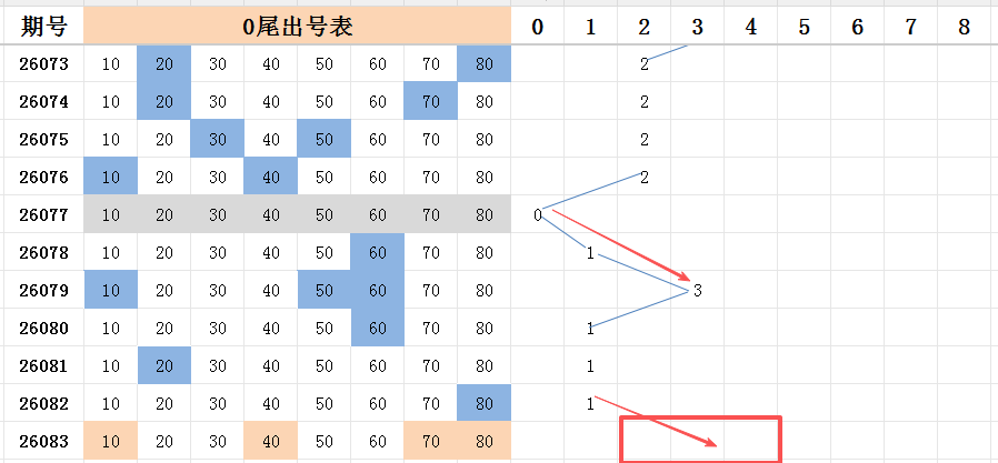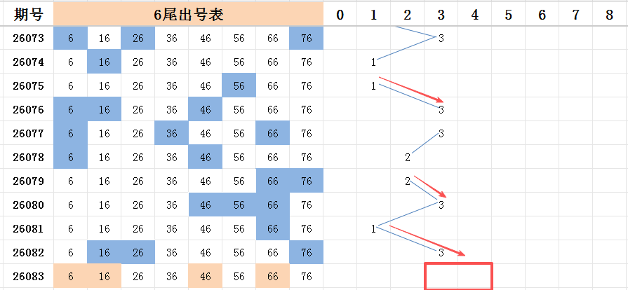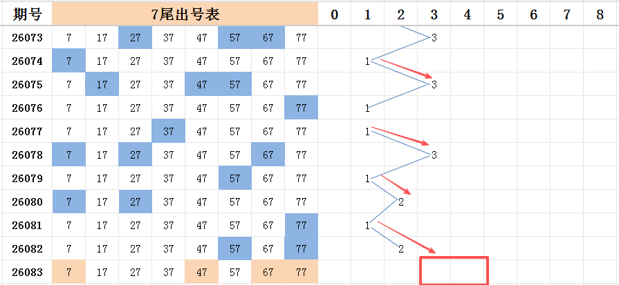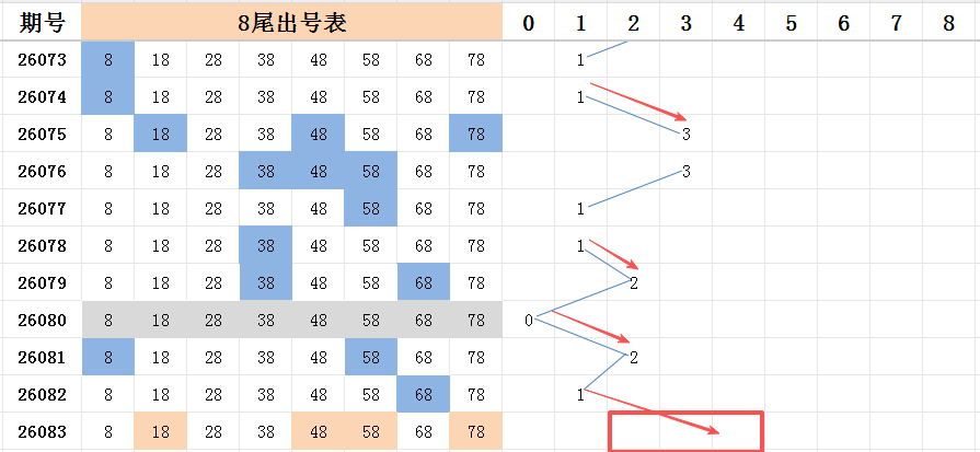 本期看好开出的范围是两码走势至四码走势之间。八尾上期开出一码走势,号码78是三斜连的号码走势,属于本尾比较有规律的号码走势,如果本尾能开出多码走势,那么有规律的号码大概率会开出。上期开出号码68的两个邻号:号码58和号码78,看好能够开出其中一个号码。