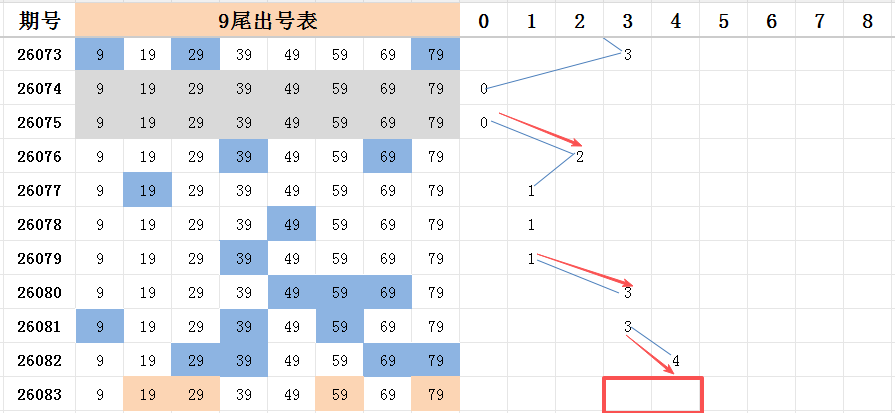 本期看好开出的范围是两码走势至四码走势之间。九尾上期开出三码走势,看好的号码开出其中三码,围中了选二复式或选三复式!本期看好号码19和号码79,能够开出其中一码,一个是四斜连的号码走势,一个是五斜连的号码走势,属于本尾比较有规律的号码走势,如果本尾能开出多码走势,那么有规律的号码大概率会开出。