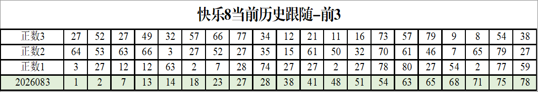 我感觉选热的同时,还要注意防冷条件开出,可以直接选取每个号码跟随出次前三的号码,也可以考虑把出次最后的三个数字加进去,不过这样可能号码太多,可以尝试。图上也能看出单独号码跟随的情况,我就不一一统计每个号码的出次了,我这里考虑提高概率,取每个号码历史跟随的前三号码和后三号码,根据2026083期的号码,我关注正数3和倒数3的号码号码为: