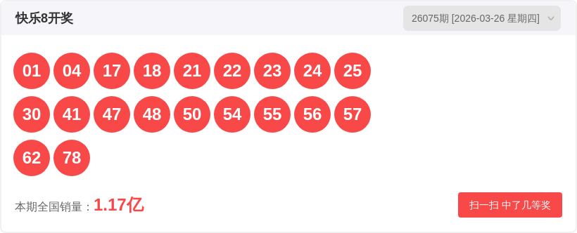 快乐826075期开奖结果01 04 17 18 21 22 23 24 25 30 41 47 48 50 54 55 56 57 62 78,和值尾3,二十区比2:0:0:0:2:4:1:1:0:01:2:1:3:1:1:0:0:0:1,四区比4:6:8:2,012路比8:5:7。