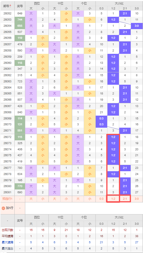 上期大小比:2:1,近10期大小比出现情况:1:2、1:2、1:2、1:2、1:2、2:1、1:2、2:1、2:1、2:1,最近10期出4期2:1,出现6期1:2,出现0期0:3,出现0期3:0,根据近10期出号规律本期推荐四连出2:1,防遗漏3期出1:2,综上所述大小比推荐:1:2,重点关注:2:1。