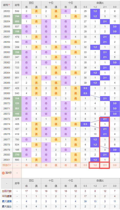 上期奇偶比:1:2,近10期奇偶比出现情况:3:0、2:1、0:3、2:1、2:1、1:2、1:2、3:0、2:1、1:2,最近10期出现4期2:1,出现3期1:2,出现1期0:3,出现2期3:0,根据近10期出号规律本期推荐连出的1:2,防隔期出2:1,综上所述奇偶比推荐:2:1,重点关注:1:2。