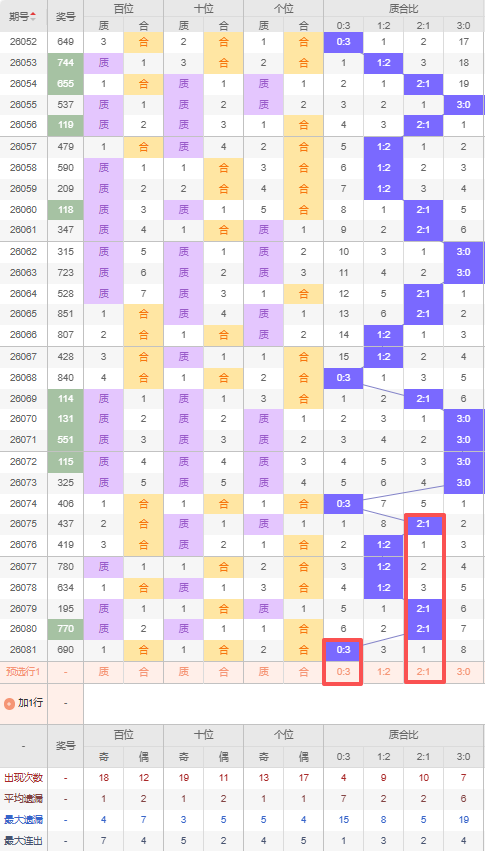 上期质合比:0:3,近10期质合比出现情况:3:0、3:0、0:3、2:1、1:2、1:2、1:2、2:1、2:1、0:3,最近10期出现3期2:1,出现3期1:2,出现2期0:3,出现2期3:0,根据近10期规律本期推荐连出3:0,防隔期出2:1,综上所述质合比推荐:2:1,重点关注:0:3。