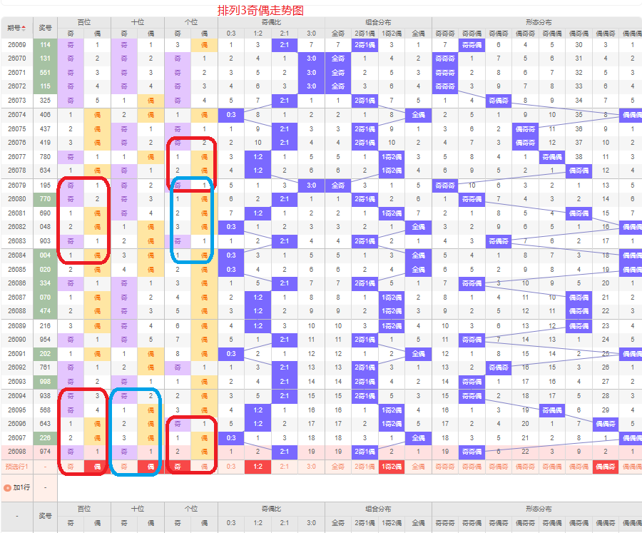 上一期的奇偶比为2:1,两奇的号码组合,从近五期的奇偶数出现情况看,奇数出6次,偶数出现9次,奇数号码出现较少,本期要侧重两偶的号码组合,侧重偶偶奇或奇偶奇的号码组合,根据奇偶组合形态可做五码定位02468/02468/13579或13579/02468/13579