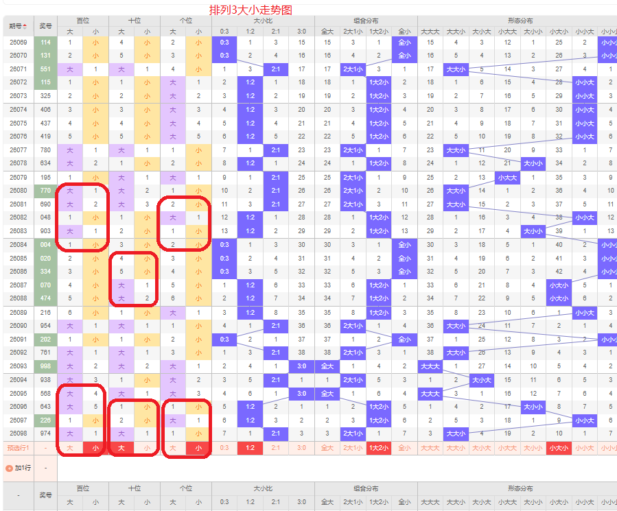 上一期大小比为2:1,两大的号码组合,近五期大号出9次,小号出6次,大号码出现较多,上一期是两大的号码组合,本期侧重两小的号码组合,百位侧重小号码,十位侧重大号码,个位侧重小号码,侧重小大小或者大大小的号码组合,根据大小形态五码定位01234/56789/01234或者56789/56789/01234