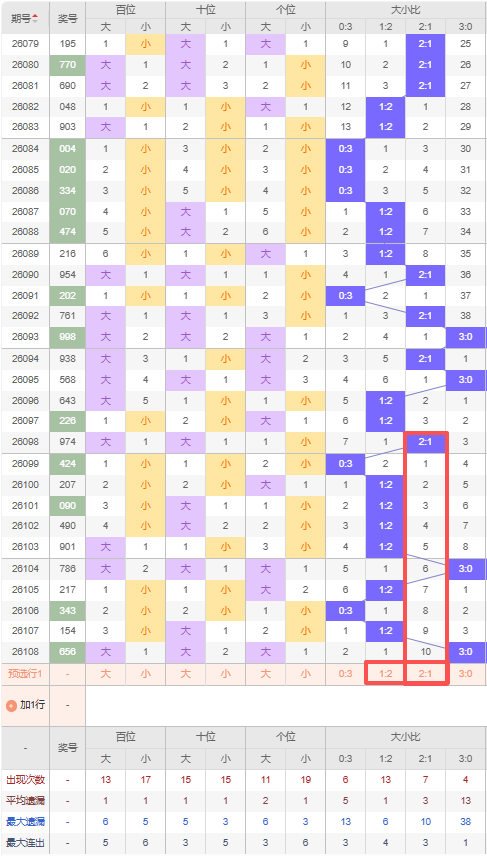 上期奇偶比:1:2,近10期奇偶比出现情况:1:2、1:2、1:2、2:1、2:1、1:2、2:1、2:1、2:1、1:2,最近10期出现4期2:1,出现5期1:2,出现1期0:3,出现0期3:0,根据近10期出号规律本期推荐遗漏9期出0:3,防连出1:2,综上所述奇偶比推荐:1:2,重点关注:0:3。