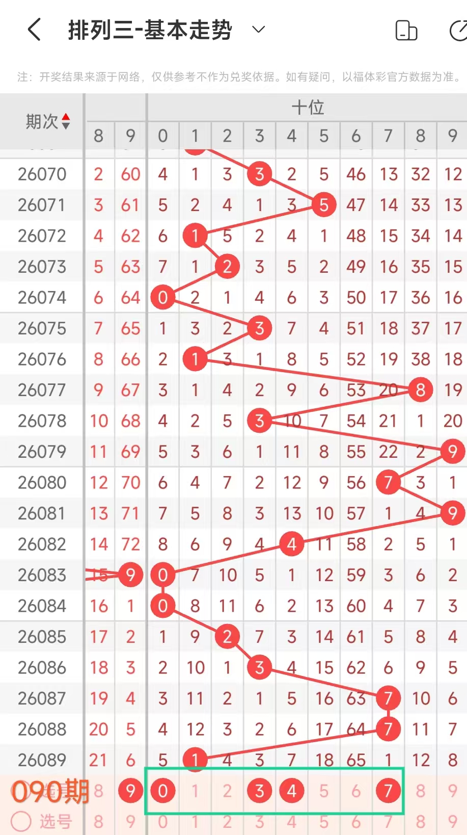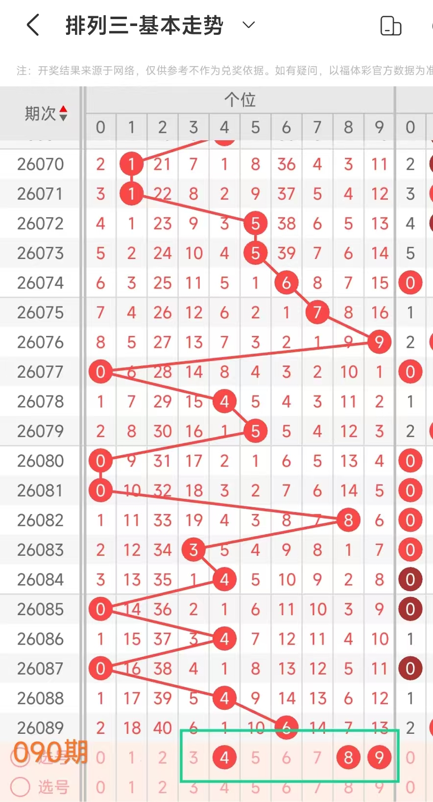 经统计0号出现4次、1号出现3次、2号出现6次、3号出现5次、4号出现5次、5号出6次、6号出现7次、7号出7次、8号出现10次、9号出现5次.统计后出现次数靠前的数字作为我们的备选号码.其号码有256789等