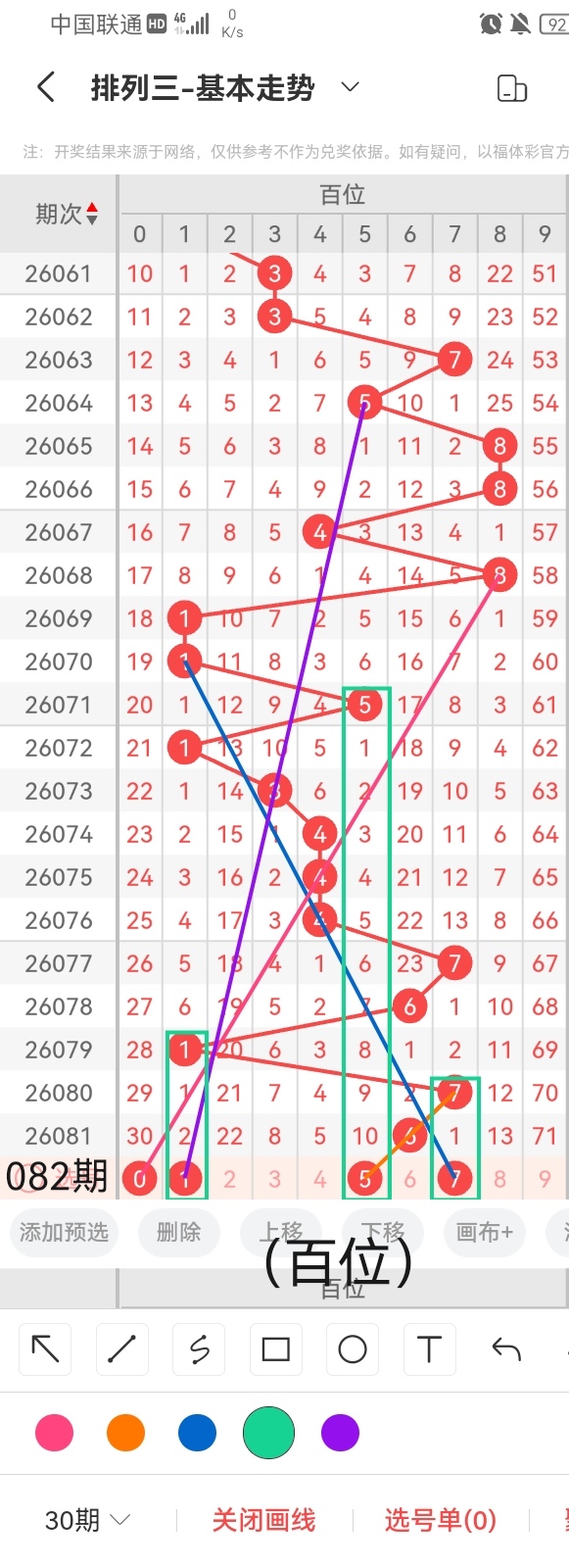 首先,小梁给大家每期分享一个体彩排列三杀百位的号码:9,正确率高达95.36%。其次,我们根据上图中画线的思路走位分析 ,遗落30期未出的号码0与前几期开出的号码呈斜三连的走势,跨度是6;号码1与前几期开出的号码呈斜三连的走势且呈隔两期回补的走位,跨度5;号码5与前几期开出的号码呈隔十期回补的走势且呈斜三连的走位,跨度为1;关注小梁知晓下期不迷路。然后,如图所示,号码7与前几期开出的号码呈斜三连的走位且呈隔期回补的走势,跨度1。综上所述,小梁本期推荐百位的号码为:0、1、5、7。
