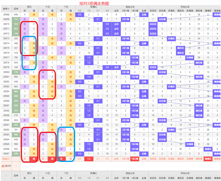 上一期的奇偶比为0:3,全偶的号码组合,从近五期的奇偶数出现情况看,奇数出6次,偶数出现9次,奇数号码出现较少,本期要侧重两偶的号码组合,侧重偶偶奇或奇偶奇的号码组合,根据奇偶组合形态可做五码定位02468/02468/13579或13579/02468/13579