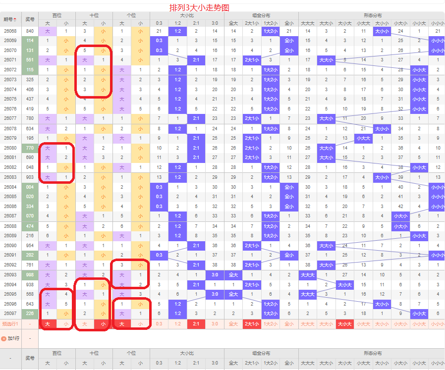 上一期大小比为1:2,两小的号码组合,近五期大号出10次,小号出5次,大号码出现较多,上一期是两小的号码组合,本期侧重两大的号码组合,百位侧重大号码,十位侧重小号码,个位侧重大号码,侧重大小大或者大小小的号码组合,根据大小形态五码定位56789/01234/56789或者56789/01234/01234
